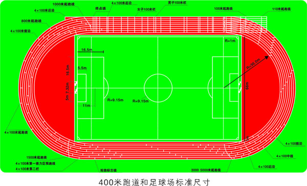 一般來講,通常說的跑道是指各級各類學校及專業體育場內的田徑場跑道,有標準跑道和非標準之分,標準跑道是指周長為400米,半徑為36.5米(另外還有36米和37.898米兩種),非標準跑道是指根據操場用地面積形狀和大小,適當地調整操場的半徑和周長,常見的有周長為200米、300米等。